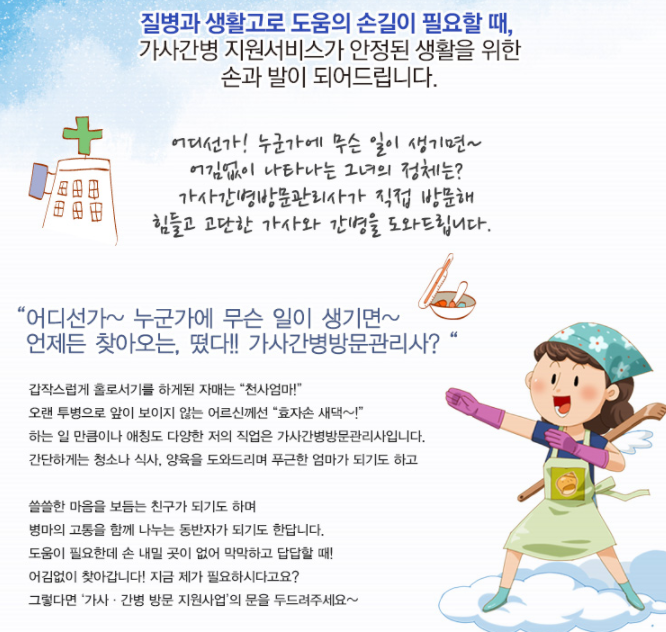 일상생활이 쉽지 않은 저소득층 가정을 위한 병간호·가사 서비스를 지원함에 따라 취약계층의 생활 안정 도모 및 사회적으로도 일자리를 창출합니다.