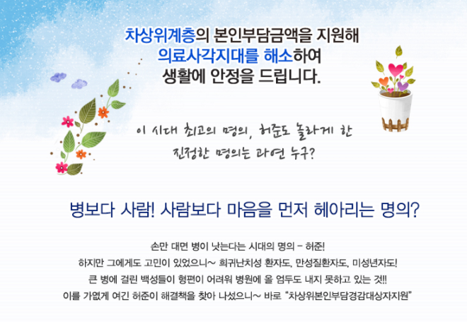 치료가 필요하다고 판단되는 차상위계층의 요양 급여 비용 中 본인이 직접 부담하는 금액을 지원하고 있습니다.