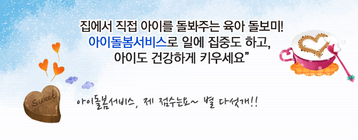 맞벌이 또는 갑작스럽게 아이를 돌볼 수 없는 일이 있을 때 육아 도우미가 방문 후 아이를 돌봅니다.