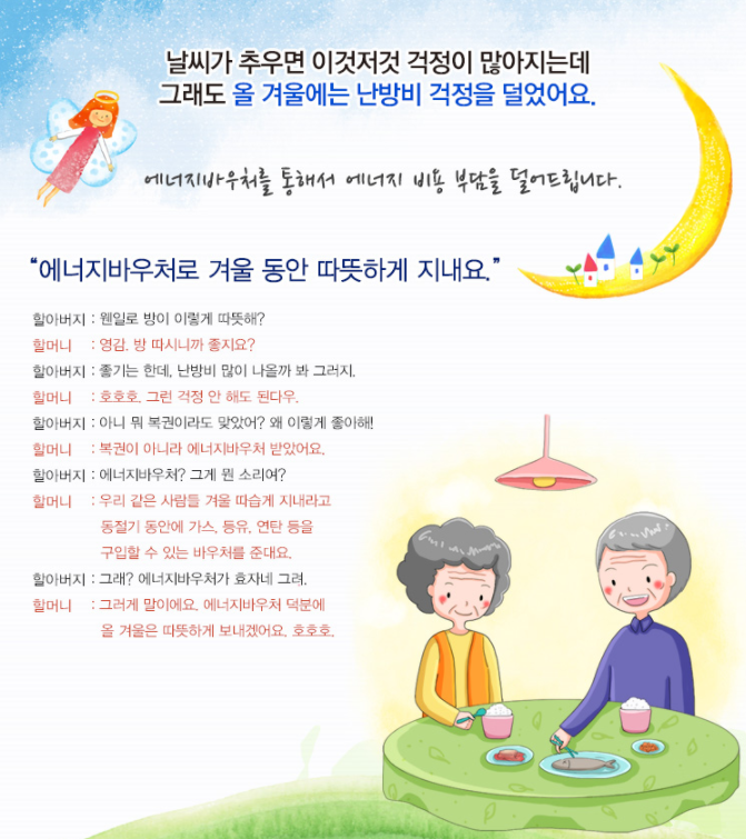 에너지 사용을 하는데 있어 취약한 저소득 가구의 동/여름철 냉난방을 위해서 에너지 사용에 도움을 주고 에너지가 보편적으로 공급될 수 있게끔 에너지이용권(바우처 형태)을 지원하는 제도입니다.