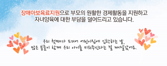 어린이집을 현재 등원하는 장애아의 보육료를 일부 지원하여 부모의 경제적인 부담을 완화시켜줍니다.