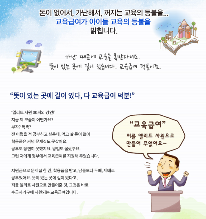 수급자에게 적정한 교육 기회를 제공하여 자립할 수 있는 능력을 배양함에 따라 가난의 대물림을 예방 및 방지합니다.