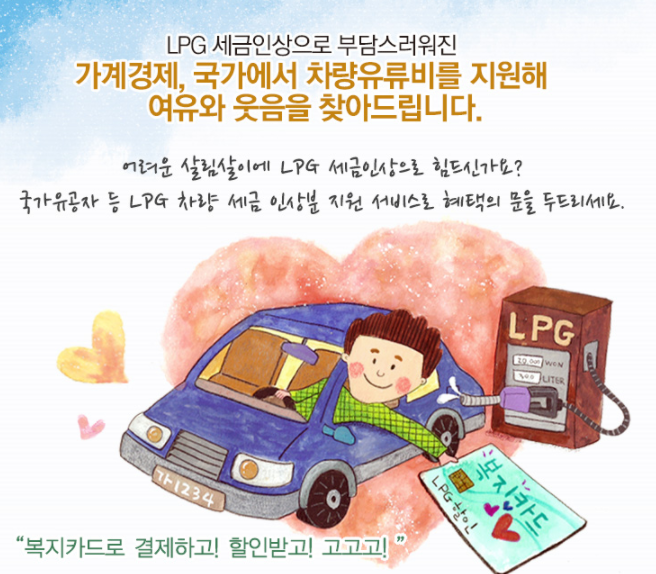 복지 카드를 이용하여 LPG 충전 시 月 300리터 범위 내에서 리터당 220원 할인 보조를 지원합니다.