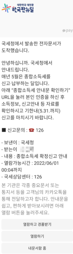 국세청에서 발송한 종합소득세 신고 관련해서 알림톡이 왔어요!
