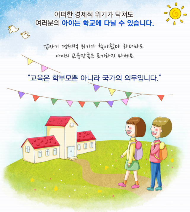 긴급지원 주 급여를 받는 가구 中, 학비 지원이 필요하다고 판단되는 초등학생이나 중학생 및 고등학생에게 지원합니다.