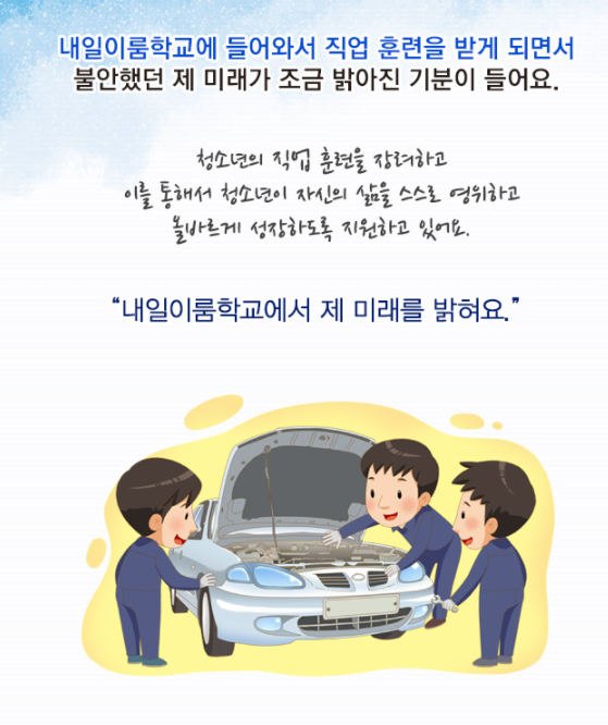 가출 및 기타의 이유로 학업이 중단되어 경제적, 사회적, 심리적으로 도움이 필요한 청소년들을 위해 맞춤형 훈련을 하여 건전한 자립을 돕고 있습니다.