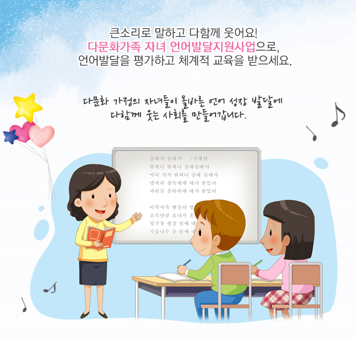 다문화가정의 자녀들이 건강하고 바람직한 사회구성원, 글로벌 인재로 거듭날 수 있도록 체계적으로 언어발달을 돕습니다.
