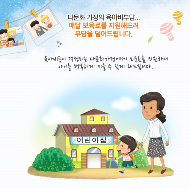 어린이집을 이용하고 있는 다문화 가정의 영유아 자녀에게 보육료를 지원함에 따라 부모들에게 양육 부담을 완화시키고, 부모가 원활한 경제활동을 할 수 있도록 돕습니다.