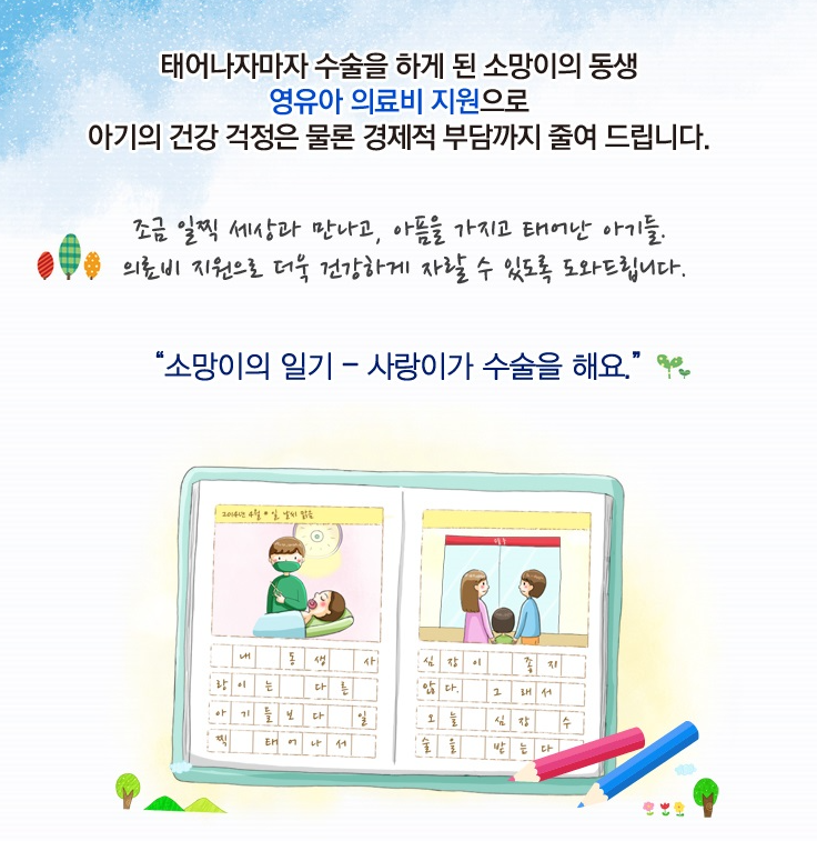 미숙아와 선천성이 상아의 수술 and 치료비를 지원합니다.