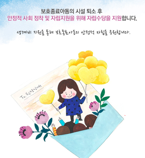 아동복지시설이나 가정위탁 보호 종료 3년 미만에 해당하는 아동을 지원합니다.