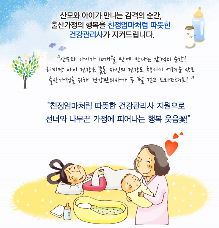 전문교육 및 자격이 있는 산모·신생아 건강관리사가 출산 가정을 직접 방문하여 산모의 건강증진 및 회복을 돕고, 신생아를 보살펴 출산 가정의 경제적 부담을 완화시켜 줍니다.