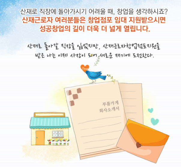 실업 중인 산업재해 근로자의 자립을 위해서 창업점포를 임대할 수 있게 지원하고 있습니다.