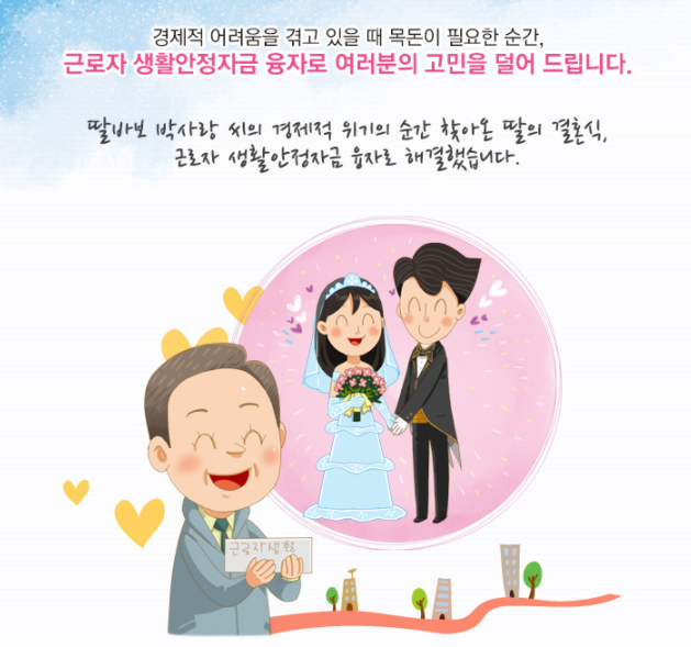 저소득층 근로자 및 임금체납 근로자가 더욱 안정적으로 생활이 가능하게 의료비나 혼례비 및 장례비, 부모 요양비, 자녀학자금, 임금감소생계비, 소액생계비 등을 장기으로 융자받을 수 있게 지원하고 있습니다.