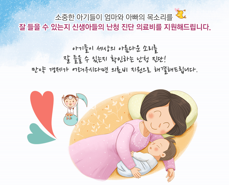 선천성 난청을 초기에 진단함에있어 조기 재활을 통해 난청을 통해 발생 가능한 언어 지능 발달장애 사회부 적응 등 기타를 예방하고 건강한 성장을 도모합니다.