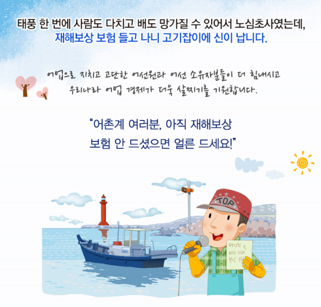 어선원이나 어선 소유자의 재해 보상보험료를 지원하고 있으나 원양어선이나 수산물 운송선은 제외됩니다.