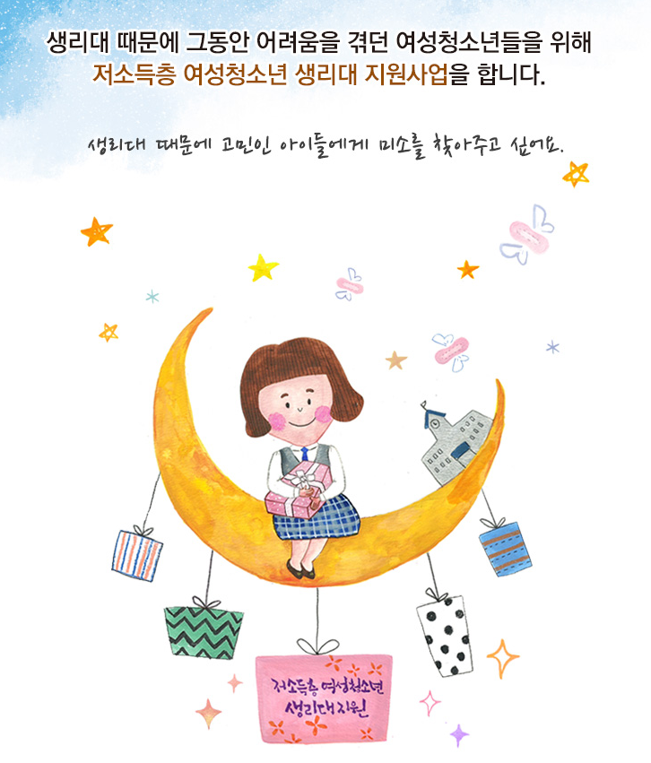 여성 청소년에게 생리대를 지원함으로써 건강하게 성장하도록 지원합니다.