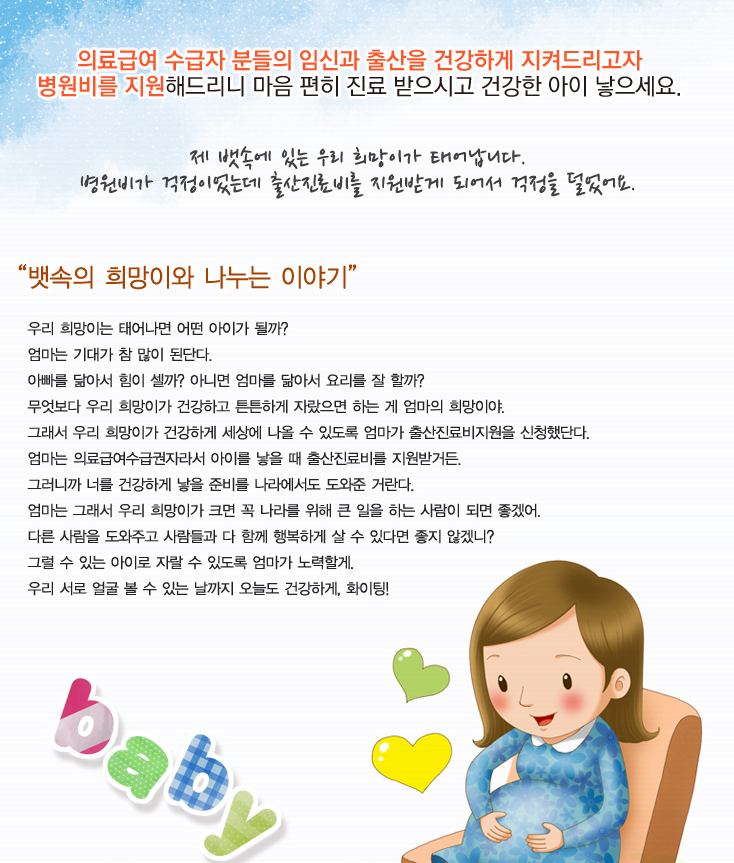 임신 증빙이 가능한 해당자에 한해 의료급여 수급권자의 임신과 출산에 필요한 의료비를 지원하는 사업입니다.