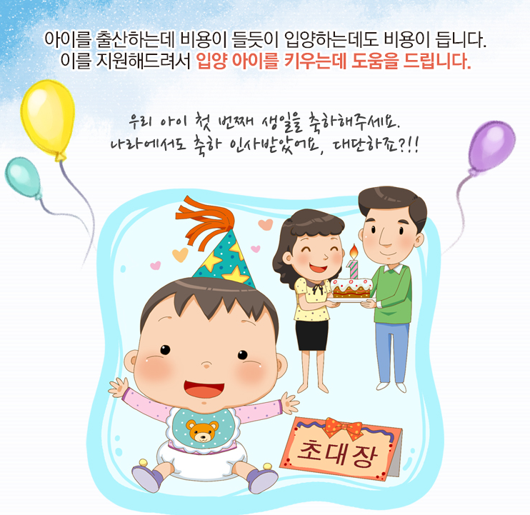아동 입양을 희망하는 가정에 입양과 관련된 비용을 지원함에 따라 국내 입양문화의 활성화를 도모합니다.