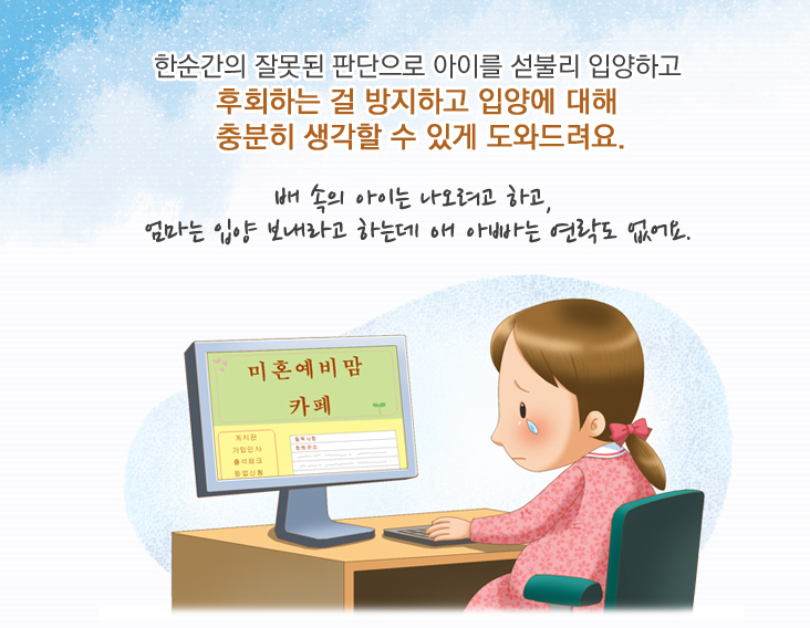 미혼했거나, 이혼을 한 부모가 출산 전후로 정서적으로 불안정한 상태로 입양에 동의하는 것을 방지하고자 입양 또는 가정의 양육에 대해 충분히 고려할 기회를 제공하는 사업입니다.