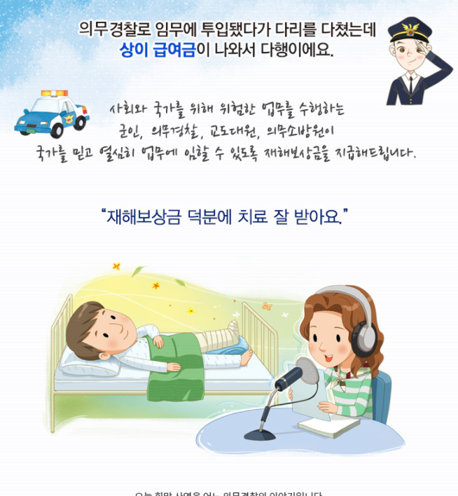 군 복무 中 사망한 군인이나, 의무경찰 등의 유족들에게 사망보상금을 지급하거나, 의무경찰 등이 복무 中 상처를 입고 퇴직한 경우 상이급여금을 지원하고 있습니다.