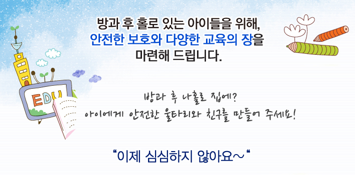 방과 이후 돌봄이 절실하게 필요한 지역사회 아동들을 위한 건전한 육성을 위해 다양한 보호·교육, 건전한 놀이와 오락의 제공, 보호자와 지역사회의 연계 및 기타 등등의 복지서비스를 종합적으로 제공합니다.