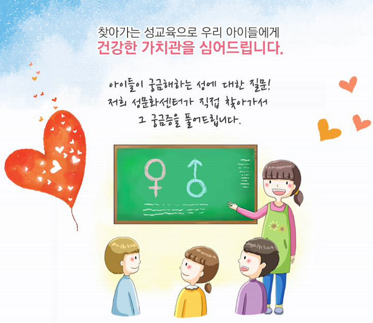 각각 다른 지원 연령에 맞춘 전문 성교육을 실시하며, 또한 유치원 및 학교 기타 등등으로 찾아가는 성교육 또한 실시합니다.