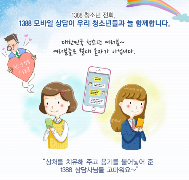 청소년 전화 1388 전화상담과 모바일 문자 상담, 카카오톡 상담 등을 운영하며 다양한 청소년의 일상적인 고민 상담부터 위기상황에 대한 상담까지 다양한 폭에서 지원합니다.