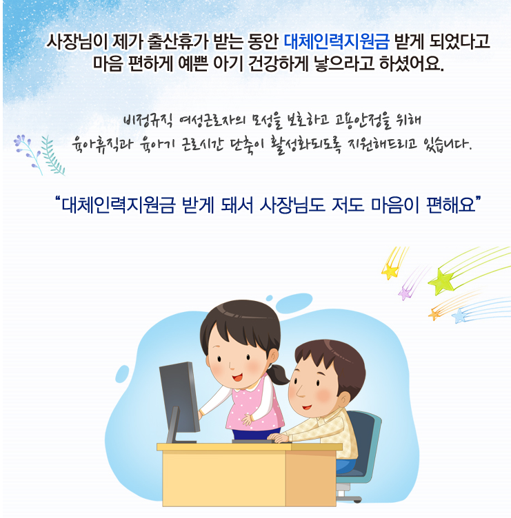 육아휴직·육아기 근로시간 단축 등에 따른 사업주의 노무 비용 부담을 줄이고, 육아휴직 관련 기타 등 기간 中 대체 인력 활용을 활용하여 고용의 안정을 추구합니다.