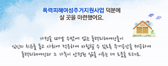 가정폭력 또는 성폭력의 피해를 입은 여성들이 자립할 수 있게 피해여성과 그들의 가족이 함께 생활할 수 있는 주거 공간을 지원하고 있습니다.